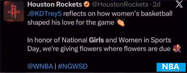 值得一提的是,火箭当天还在庆祝全美体育职业女性日(National Girls & Women in Sports Day)。